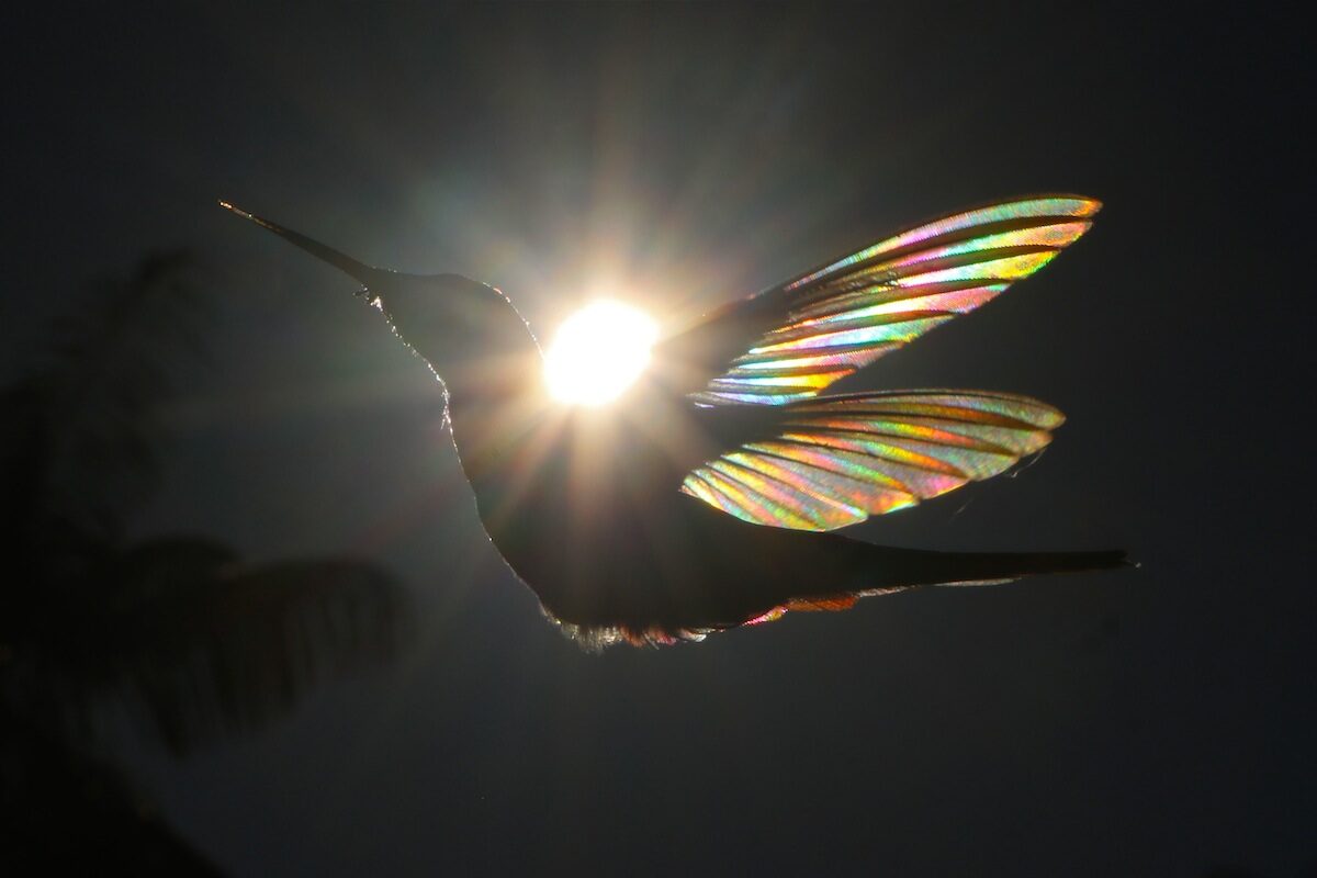 Explaining the resulting bewildering image called “Winged Prism,” Spencer wrote on his website, “[t]he photo captures the exact moment in which the sunlight penetrates the wings of a Black and white Jacobin hummingbird revealing a secret of nature that cannot be seen with our eyes.”