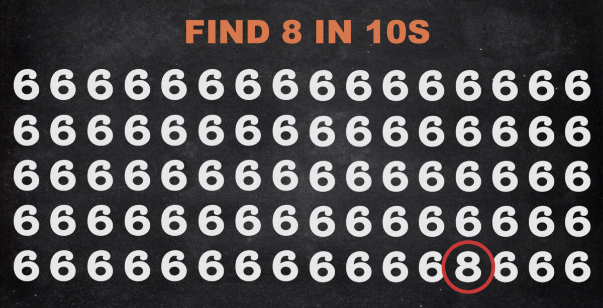 The second illustration contains rows and columns, all filled with the number six. However, amongst all the sixes, there is one concealed digit. It’s a number eight amongst all the sixes. Have you noticed it? Pay close attention to each corner, row, and column of the image and try to find that sneaky eight as fast as possible.