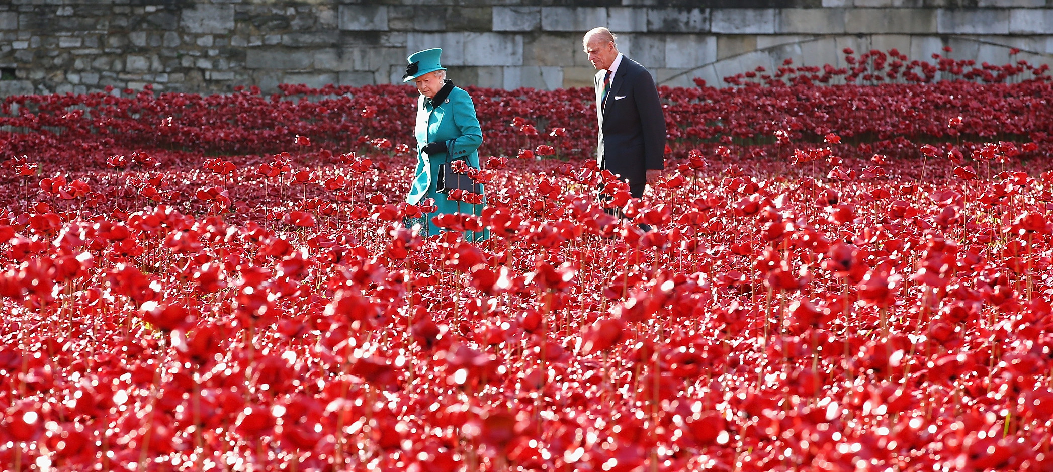 Queen Elizabeth II and Prince Philip, Duke of Edinburgh visit the Blood Swept Lands and Seas of Red evolving art installation at the Tower of London on October 16, 2014 in London, England. (Photo by Chris Jackson/Getty Images)