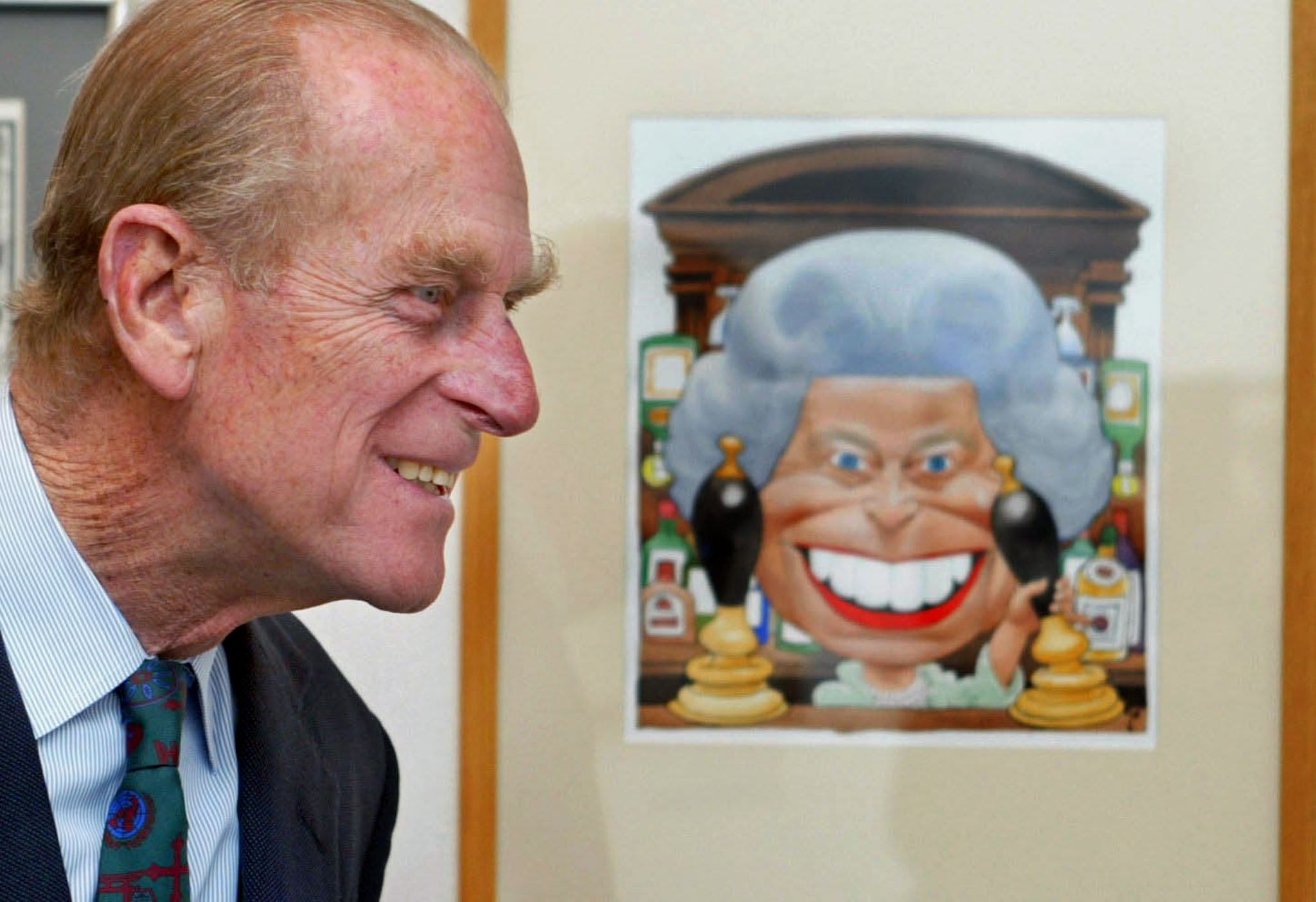Britain’s Prince Philip stands beside a cartoon of his wife Britain’s Queen Elizabeth II behind the bar in the Old Vic pub from the TV show Eastenders drawn by Trogg for the Golden Jubillee, Wednesday, Dec. 4, 2002. (AP Photo/Chris Harris/The Times/WPA pool)