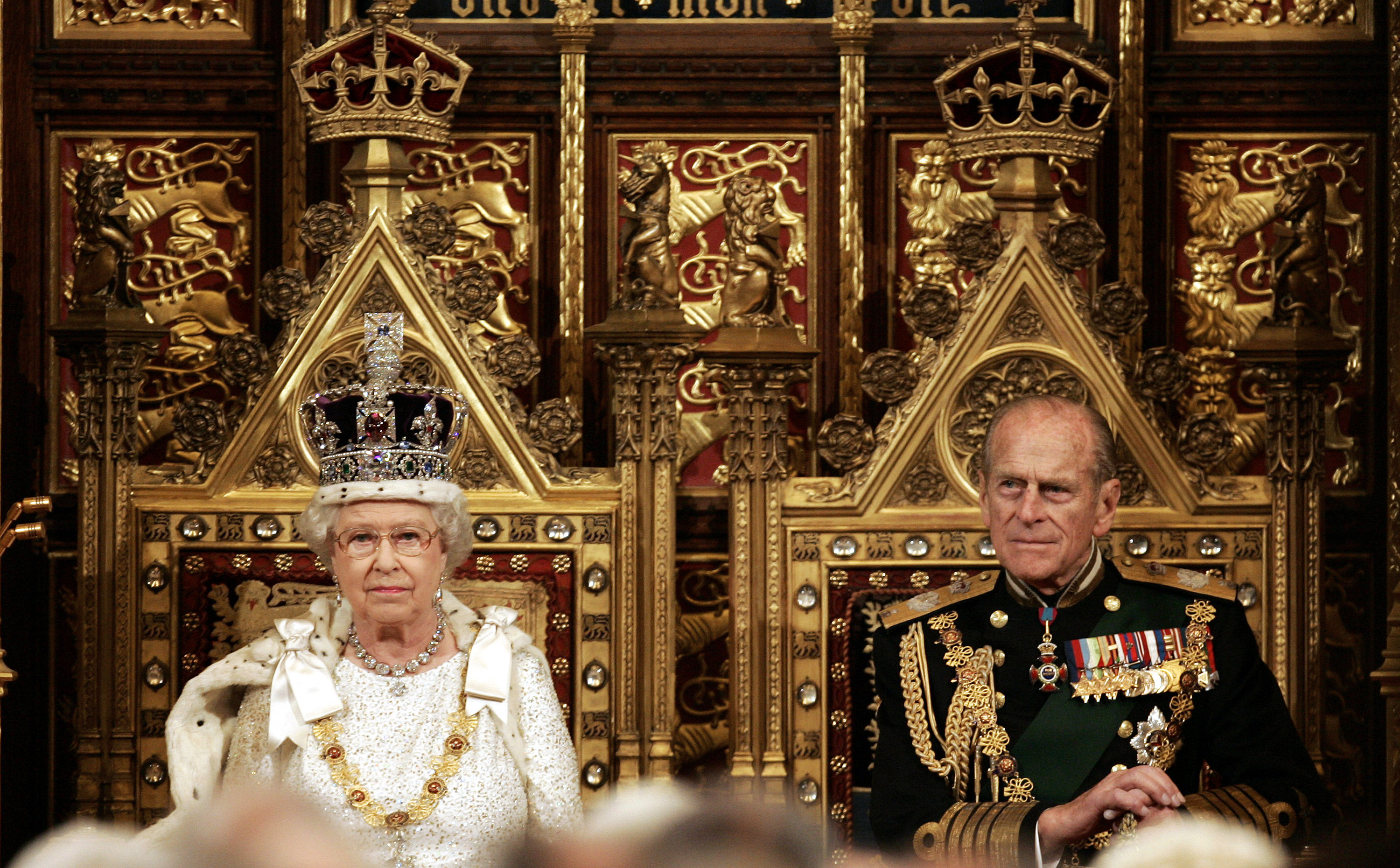 Britain’s Queen Elizabeth II wearing the Imperial State Crown sits upon the Throne, with Prince Philip, right, prior to reading the Queen’s Speech which outlines her Governments legislative program for the coming Parliamentary year, in the Palace of Westminster, London, Wednesday Nov. 15, 2006. (AP Photo/Alastair Grant WPA POOL )