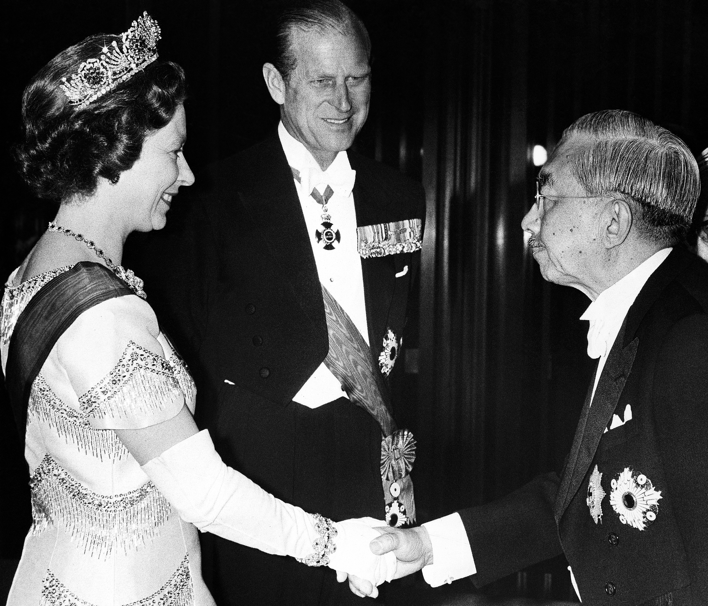Queen Elizabeth II and Prince Philip are greeted by Emperor Hirohito of Japan, the entrance of the Imperial Palace in Tokyo on May 7, 1975, British Royal couple arrive for an Imperial by the Japanese Majesties. (AP Photo)
