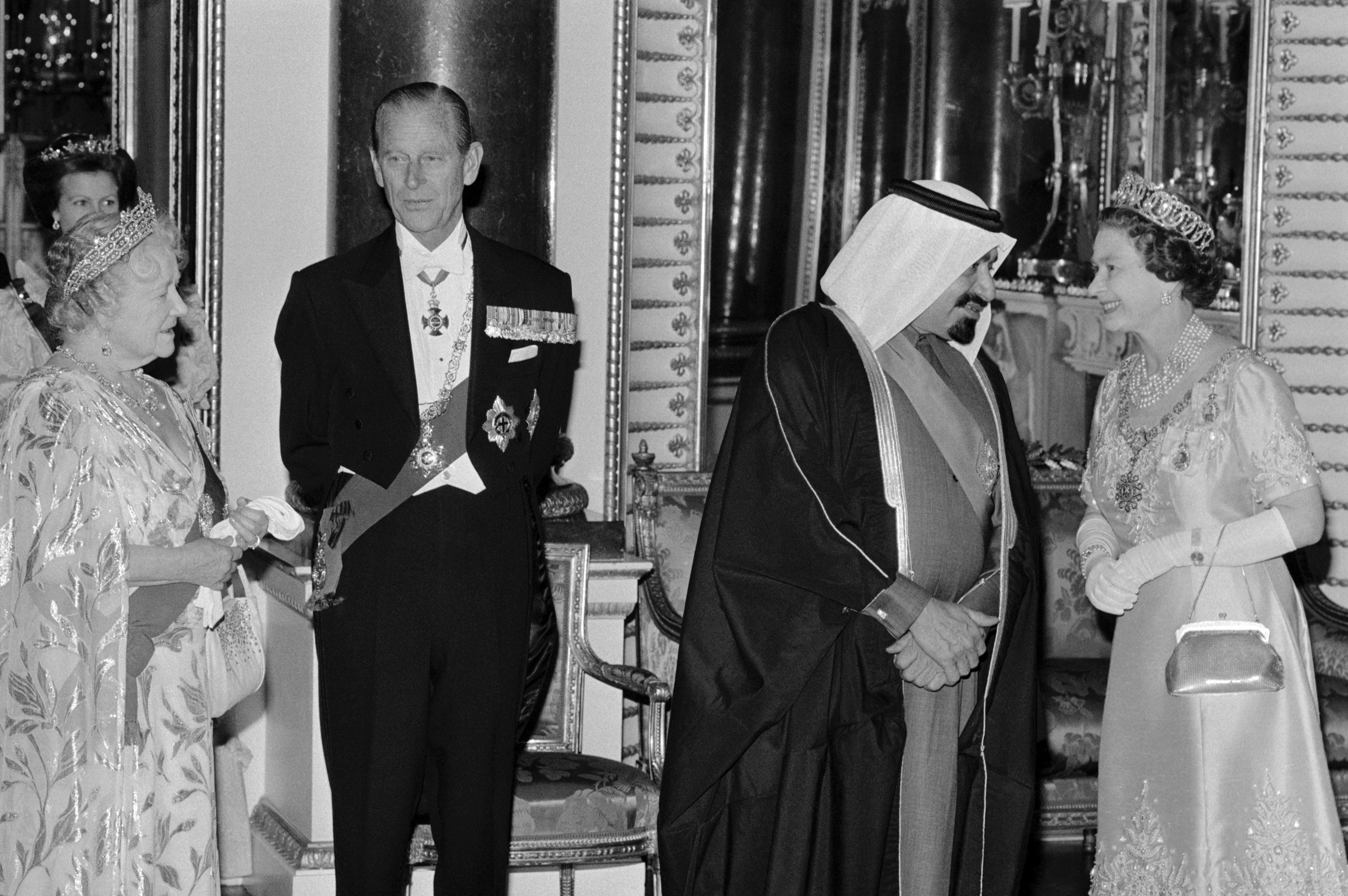 Britain’s Queen Elizabeth II and the Emir of Qatar Shaikh Khailfa bin Hamad Al Thani share a laugh together prior to a state banquet hosted by the Queen at Buckingham Palace in London on Tuesday, Nov. 15, 1985. (AP Photo)