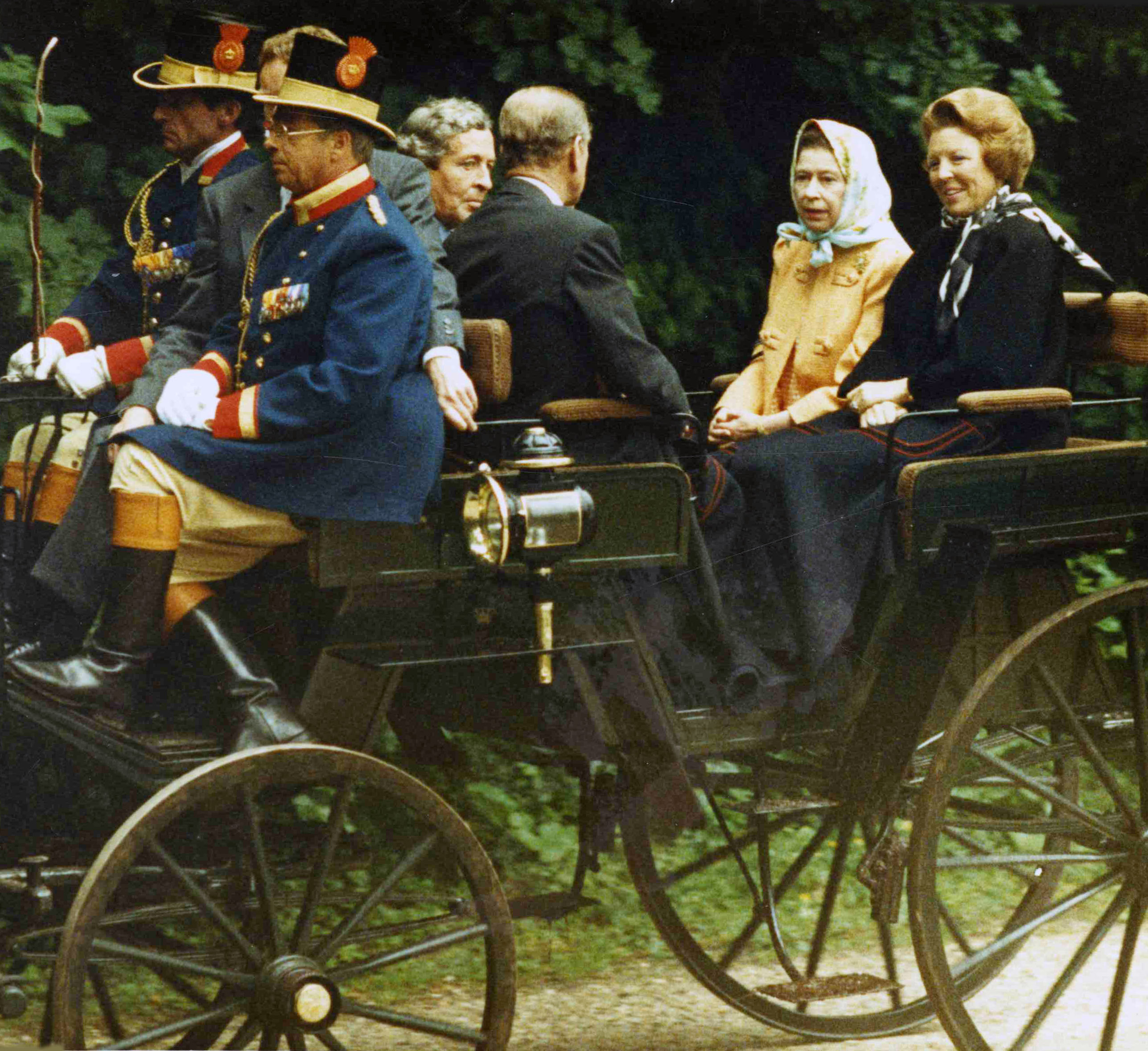 Britain’s Queen Elizabeth II, second right, and Dutch Queen Beatrix, right, sit facing their husbands, Netherlands Princes Claus, fourth from right, and Britain’s Prince Philip, with back to camera,during an open air horse drawn carriage ride through the woods surrounding the Het Loo Palace, in Apeldoorn, on July 5, 1988. (AP Photo/Str/Vogelzang)