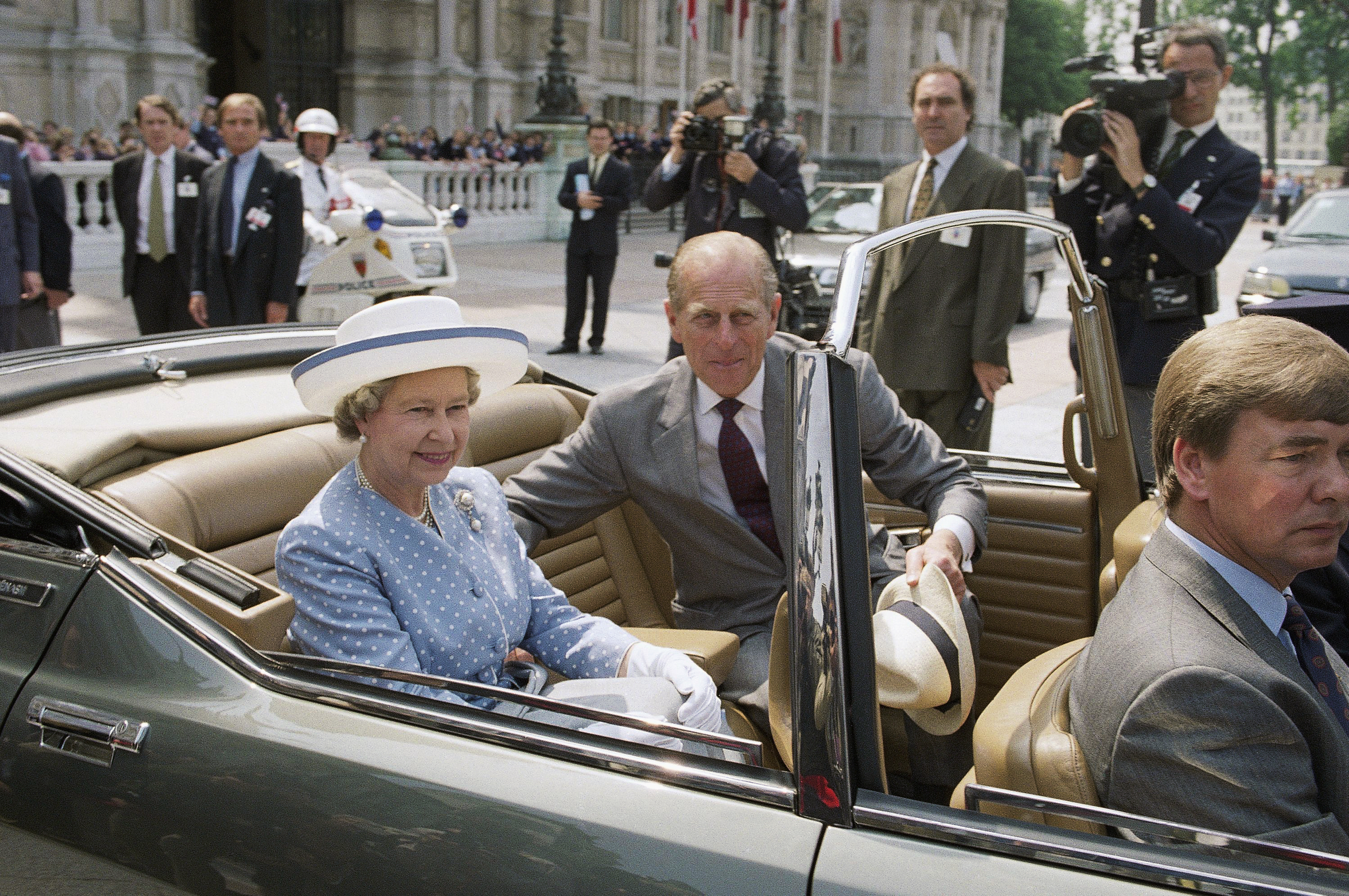 Britain’s Queen Elizabeth II and her husband Prince Philip are seated in a convertible French-made Citroen SM as they leave the Paris City Hall on Wednesday, June 10, 1992 after meeting with Paris Mayor Jacques Chirac on the second day of the royal couple four-day state visit in France. (AP Photo/Laurent Rebours)