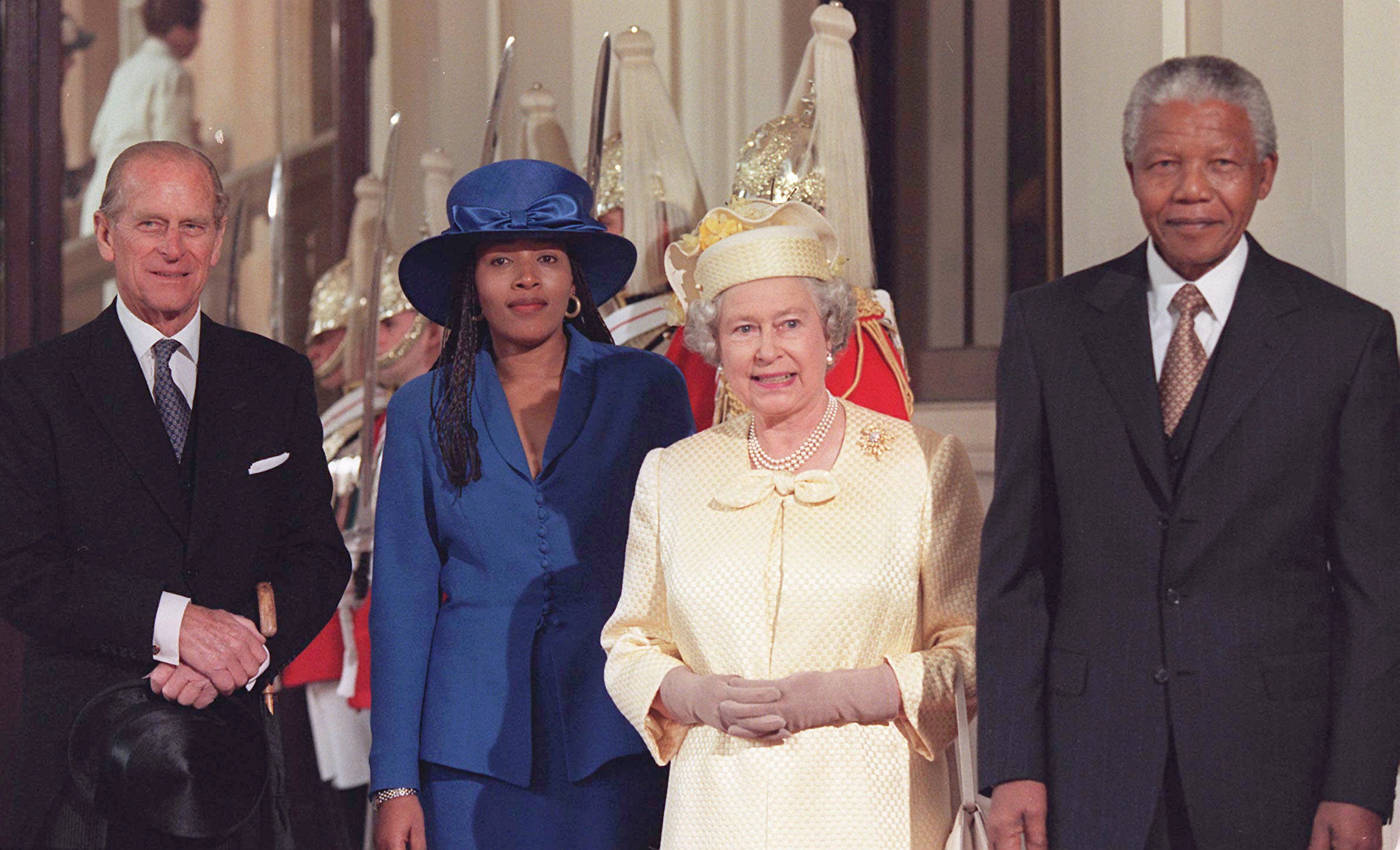 Britain’s Queen Elizabeth poses with South African President Nelson Mandela, his daughter, Princess Zenani, and Prince Philip, at Buckingham Palace in London Tuesday July 9, 1996. President Mandela is in the United Kingdom on a four-day state visit.(AP Photo/John Eggit/POOL)