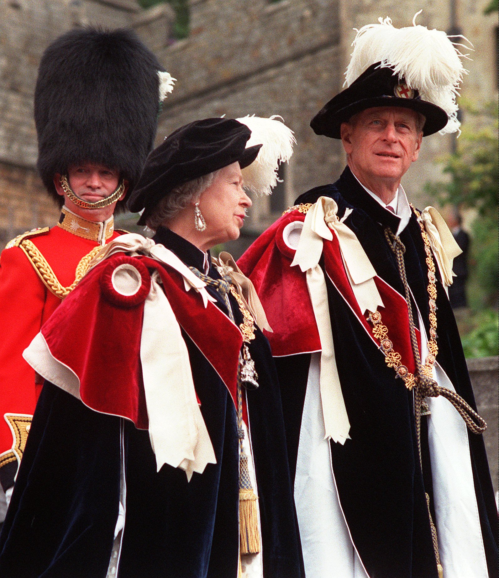 Britain’s Queen Elizabeth II and her husband Prince Philip, right, lead the annual procession of members of the Order of the Garter from Windsor Castle to St. George’s Chapel in Windsor, England Monday, June 15, 1998. (AP Photo/Alastair Grant, Pool)