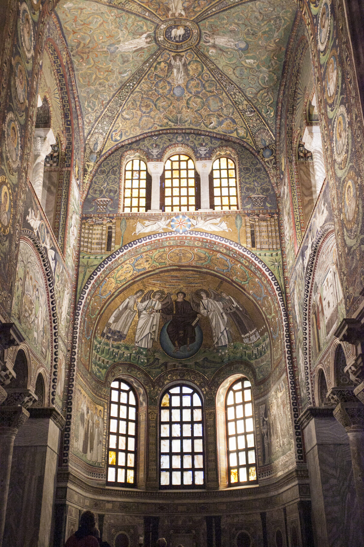 Dazzling in detail, color, and artistry, its famous mosaics cover the walls and ceilings of basilicas, baptistries, chapels, and mausoleums. The differences in scale are also bewildering, from the small Mausoleum of Galla Placidia, where the ceiling is an exquisite dark blue, starry sky of mosaics, to the Basilica of San Vitale, whose soaring columns draw the eyes heavenward to mosaics that glitter green and gold.