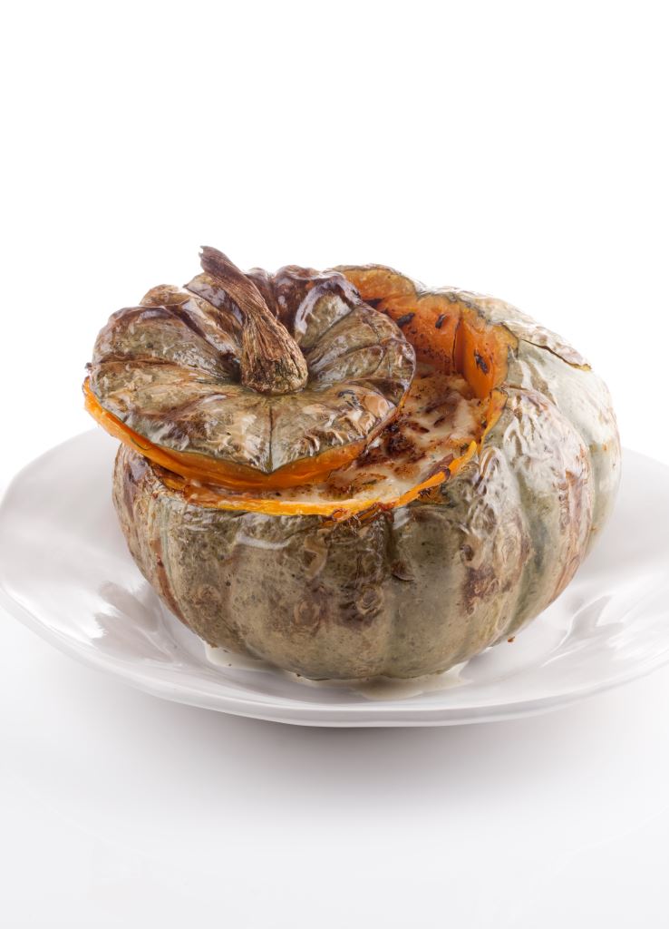 Meanwhile, turn the cheese pumpkin upside down, and with a small serrated paring knife, remove a circular cap wide enough to later fill the pumpkin with stuffing (approximately 10 inches in diameter). Cut the sourdough bread into 1 inch thick slices and toast. Lightly rub the toasted bread with the clove of garlic. In a medium sauté pan over medium heat, add the bacon and cook, stirring, until crispy. Remove the bacon with a slotted spoon, drain on a paper-towel lined plate and set aside. When the cooked kabocha squash is cool enough to handle, remove the flesh with a spoon and cut into a rough dice. In a mixing bowl, whisk together the half and half with the ground spices, and salt and pepper to taste. Sprinkle the inside of the pumpkin with salt and pepper. Begin filling the pumpkin by starting with a layer of bread, then half of the bacon, half of the walnuts, half of the pumpkin seeds, half of the chives, and half of the cheese. Pour in about half of the half and half mixture and lightly press down. Repeat with remaining filling ingredients to reach the top of the pumpkin. Pour in the remainder of the half and half to reach the rim. Return the cap to the pumpkin and transfer onto an aluminum foil lined baking tray. Bake for 1 1/2 to 2 hours, or until the cheese pumpkin is cooked though. Serve warm, scooping a bit of the cheese pumpkin from the sides along with the filling.