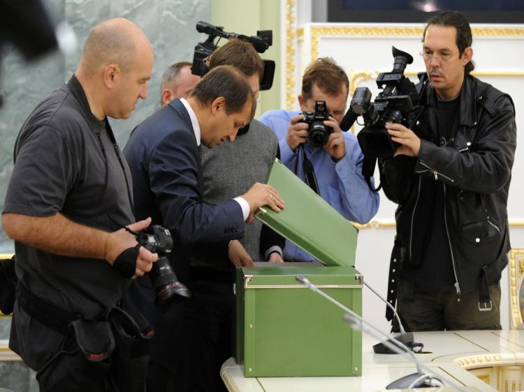 Saak Karapetyan, head of the international legal department at the prosecutor general’s office, gave two boxes of documents to Polish diplomats during a joint press conference at the prosecutor’s office in Moscow.