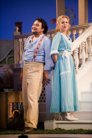 The most striking feature of the production was a kind of cultural “grafting,” infusing this very Italian opera with a very American feel. The centerpiece of the brightly-lit set was a pavilion structure or gazebo with prominent colonial elements, such as one might find on a public square in a small town in, say, Napa Valley circa 1915. A Model-T Ford ice cream truck parked to the side of the stage, and the stars and stripes adorning the pavilion’s eaves set the scene squarely in Anytown, USA. This highly original twist to Donizetti’s opera was conceived and designed by director James Robinson.