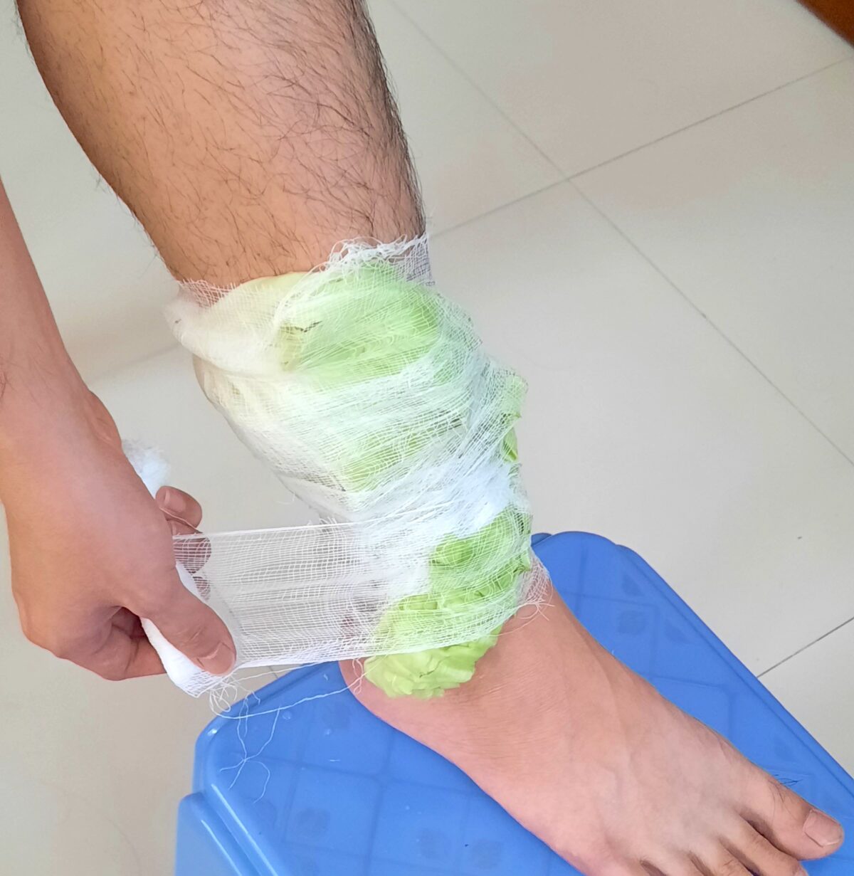 - Wrap the leaf in aluminum foil and gently warm it in the oven on a low setting for 2–3 minutes. Next, place the leaf onto the affected area of skin, and bind it tightly in place using a strip of bandage or gauze. Keep the cabbage compress on the skin for one hour. If you don’t exhibit any skin sensitivity, the cabbage compress can even be left on overnight.