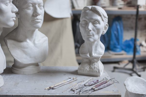 In the studio, Mostow is surrounded by his works in progress. His own sculptures emit an ethereal quality, yet also have a down-to-earth presence about them. Some of the portrait busts have smooth eyes, without any indication of the irises or pupils, giving them a more ethereal quality.