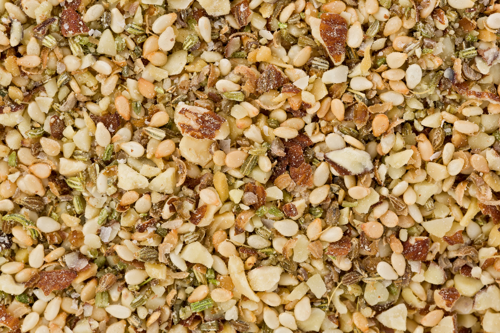 My favorite version is very simple: roasted pistachios, toasted sesame seeds, toasted coriander, sumac, and orange zest. I prefer to chop the pistachios so that the nuts keep a crunch to them while crushing the other ingredients in a mortar and pestle.