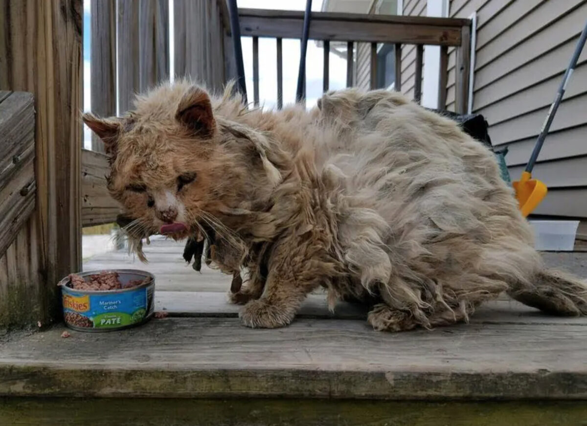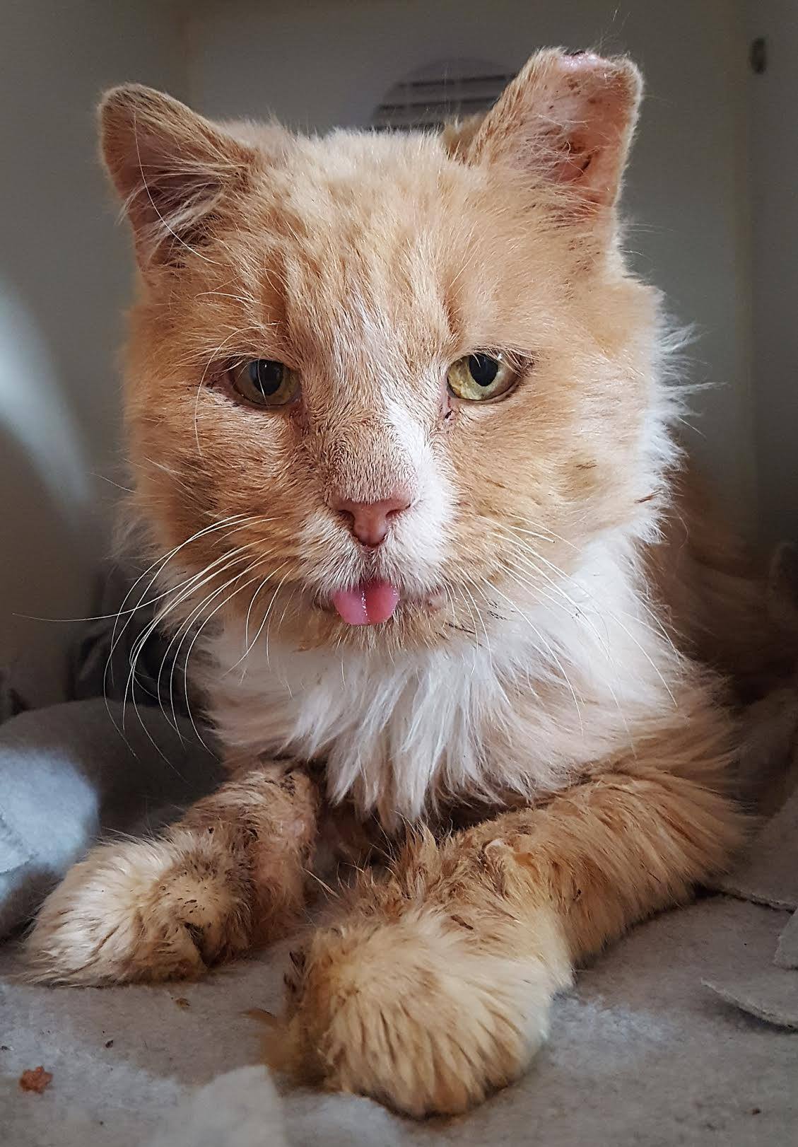 The ginger cat was in a bad shape. He was covered in dirt and mats, and the rescuers from Lowell Trap Neuter Return Coalition had to use traps to get Frisbee to safety.