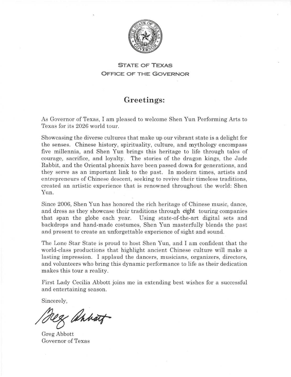 “The Lone Star State is proud to host Shen Yun, and I am confident that the world-class productions that highlight ancient Chinese culture will make a lasting impression,” Mr. Abbott wrote in a congratulatory letter.