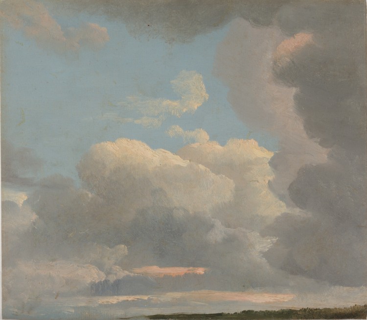 After he moved to Rome from Paris, he produced hundreds of paintings, taking nature as his teacher. His paintings show an intuitive understanding of atmosphere. In an 8-by-10-inch study of clouds, he simply and deftly executed layers of voluminous clouds, and with two dashes of pink peeking through them, reveals that the time was early evening, as the sun had almost disappeared into the horizon.