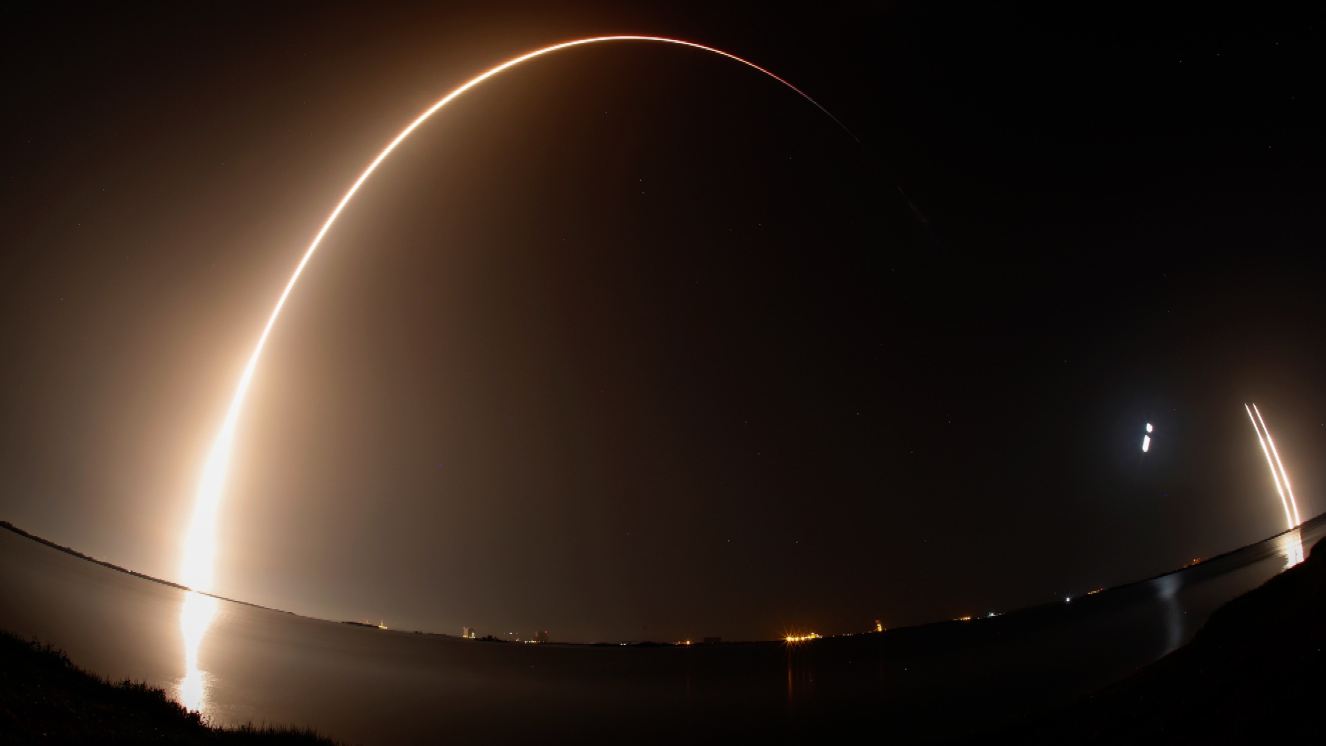 The two side booster rockets returned safely to Earth, descending onto adjacent Air Force landing pads, but the rocket’s center booster missed its mark, crashing in the Atlantic Ocean.