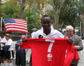 New York City Homeless Services commissioner presented jerseys to the team on Thursday in Roosevelt Park, in Manhattan. Later, players from The Red Bulls professional soccer team warmed up with the two street soccer teams, the men's and the women's.