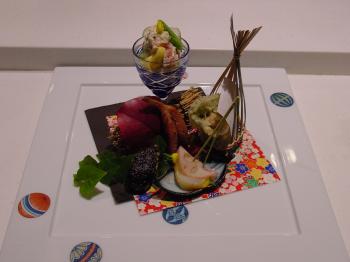 Samurai Maxi said, “A man who has attained mastery of an art reveals it in his every action.” You can see that as you are watching Chef Suzuki preparing each plate Kaiseki style: It is a cuisine that has no short cuts and requires the gentle yet skilled hands of a very well-trained master. Traditionally, this was prepared by monks for monks in small portions to keep them from feeling tired or sleepy. “Kai” means stomach and “seki” means stone and it is for the Buddhist monks to carry warm stones in their robes to quiet their hunger.