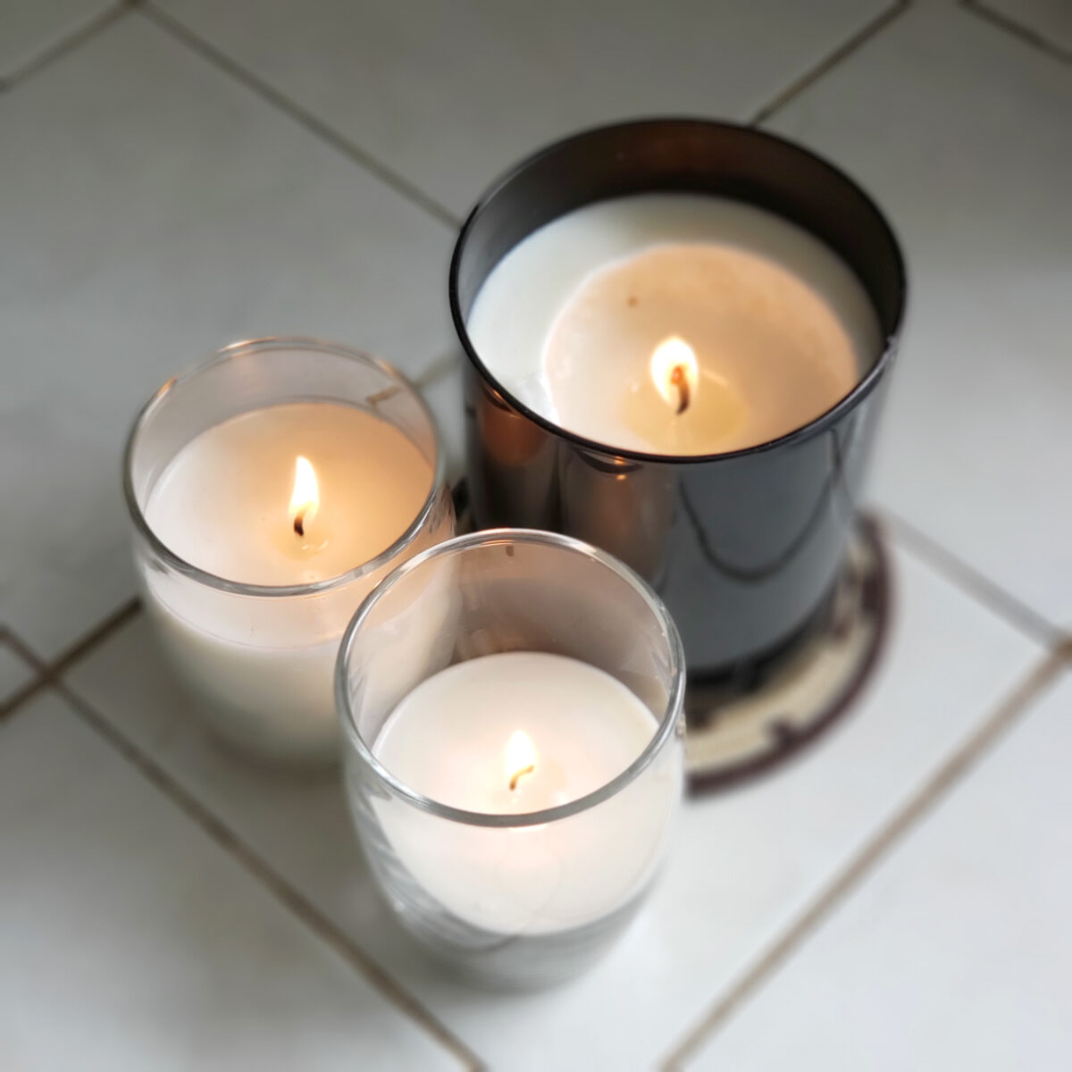 She opted to use soy wax instead. She melts the flakes down using a double boiler system and adds in different colors and scents. She then centers the wick in a reusable glass or metal container and slowly pours in the wax. The candles are left to set for two weeks and are then ready to use.