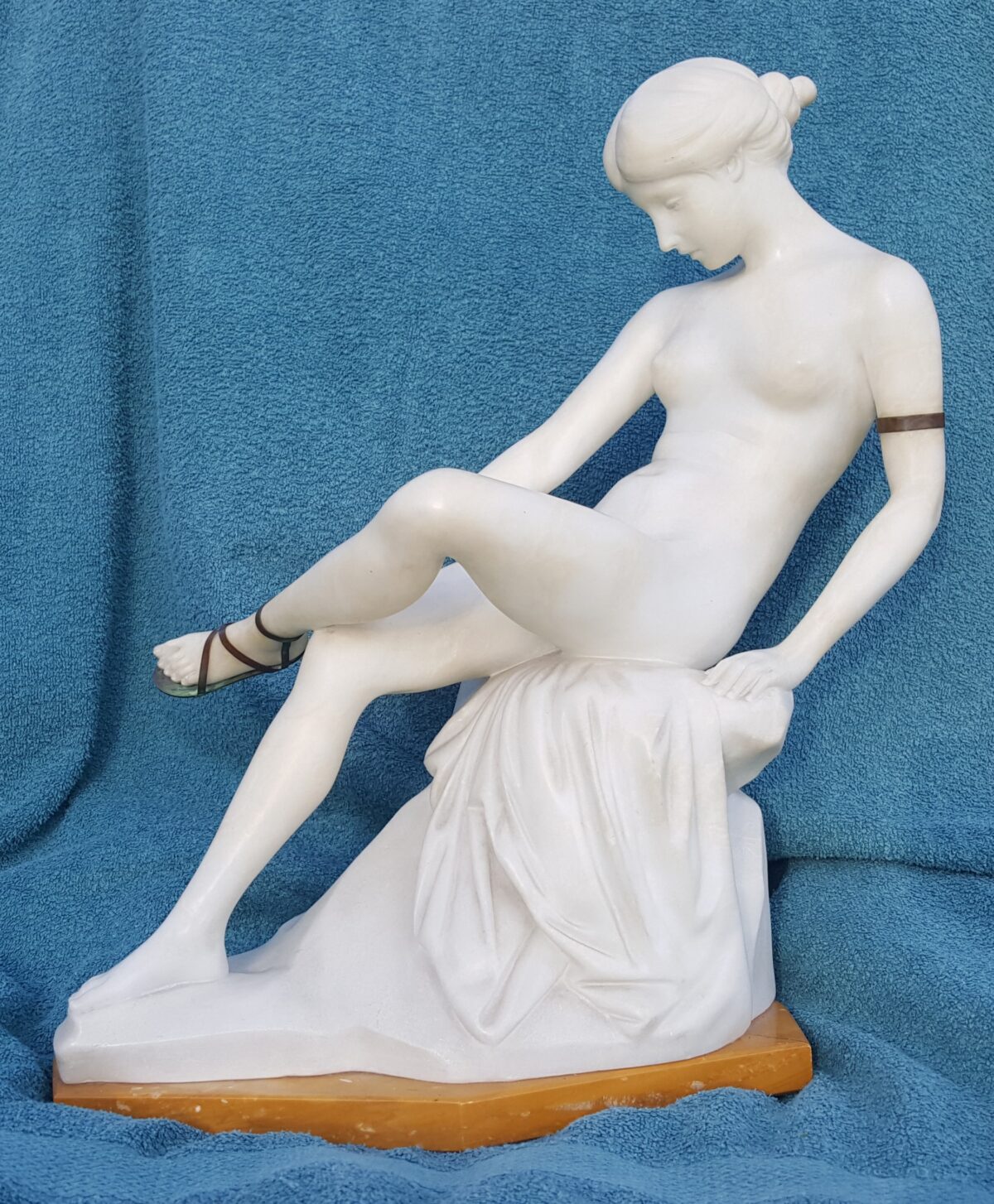 She picks up a sandal and reclines to slide it onto her foot. It is the beginning of another day. But she cannot know this moment will be captured in stone. The year is 1920, and it will be 99 more before her image, in this idyllic place, will be described in long-deserved words. And thank you, Ernst Seger, for bringing to life, this—”Seated Maiden Lacing Her Sandal.”
