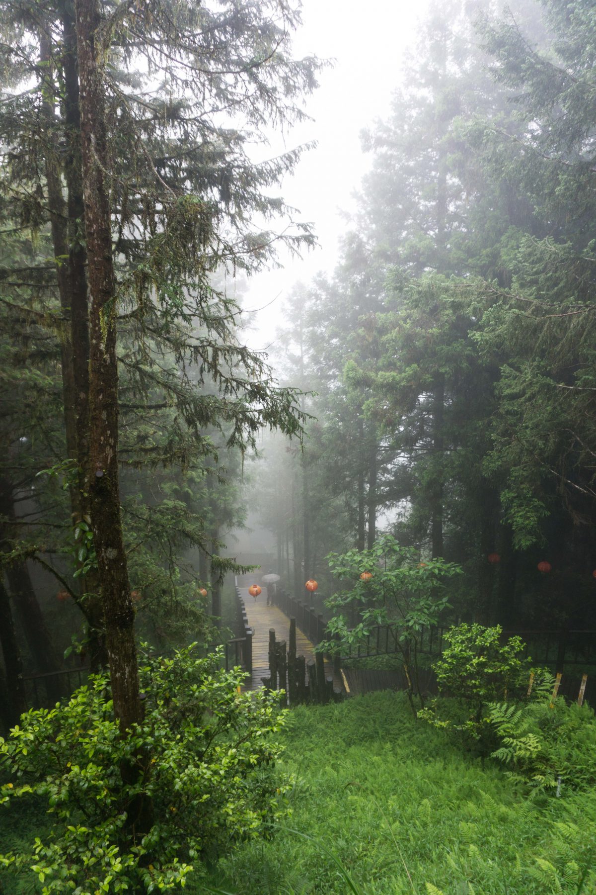 The route we’ve chosen, the Cypress Forest Trail leading into the Chinese Hemlock Trail, lies within a region designated as the “ancient forest park area,” marked with an old wooden gate carved with Chinese characters and hung with glowing red lanterns. More lanterns line the long flight of steps from the gate up to the trailhead, where Zhen’an Temple guards the entrance.