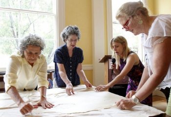 Ziegelman brought dough, a container of sliced pears, and a few table cloths—all that is necessary to make a strudel. With the help of a few volunteers from the audience, the small ball of dough was stretched to a formidably sized sheet. To demonstrate the ingenuity of the housewives of the past, Ziegelman used pieces of cloth to wrap the delicate dough around the pears. The audience clapped and cheered.