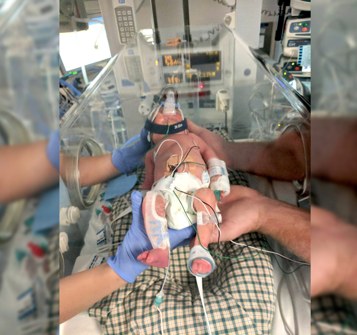 Renee went into labor at 31 weeks. She was “flown with only the clothes on my back” by Australia’s Royal Flying Doctor Service to Brisbane, where baby Samson, weighing 1.6 kilograms (approx. 4.4 pounds), was delivered via emergency cesarean section.