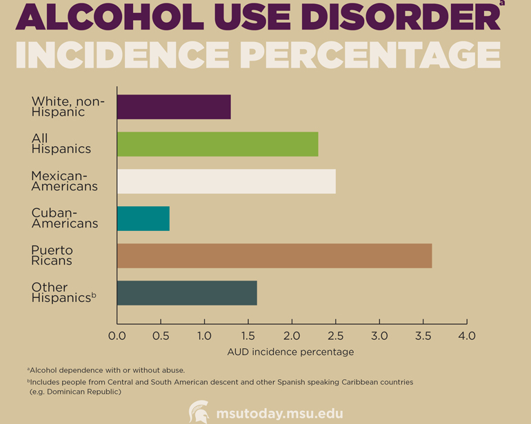 His study indicates the annual incidence rate of alcohol abuse among Mexican- Americans is more than twice that of Caucasians, with Puerto Ricans showing almost three times the risk.