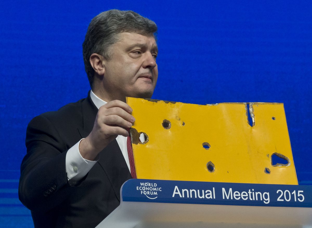 Addressing the World Economic Forum in Davos, where he appealed for political and financial support, President Petro Poroshenko held up a piece of a bullet-riddled bus as evidence of shelling last week by heavy artillery in “occupied” parts of Ukraine.