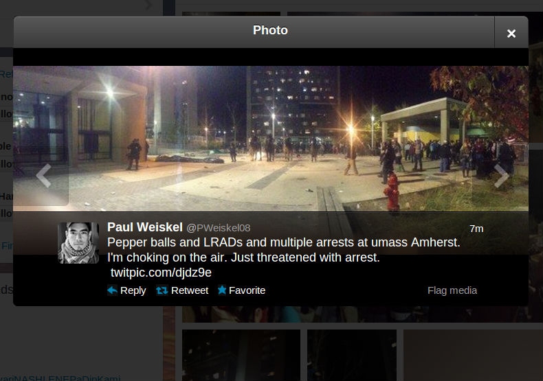 Paul Weiskel, a photographer in Boston, was also tweeting photos of the scene, including a close-up of a tear gas grenades that he said police were throwing at students.