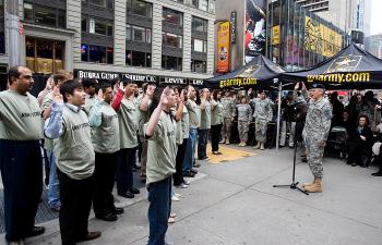 At Times Square, the national anthem was played to launch the event. Soldiers stood in full salute as the music played. A batch of new recruits stood in line, some enduring the cold wind calmly while awaiting the arrival of Army Chief of Staff General George Casey Jr. who would conduct the ceremony to swear them into service.
