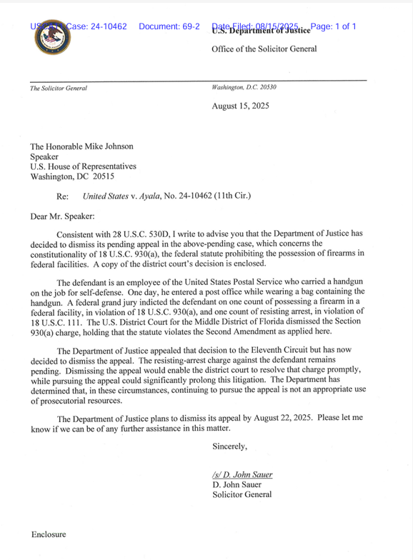 In a letter issued to House Speaker Mike Johnson (R-La.) on Aug. 15, the DOJ stated that it dismissed its pending appeal in the case known as United States v. Ayala, which involved a U.S. Postal Service truck driver who had a concealed carry permit and carried a concealed pistol while walking into a post office.