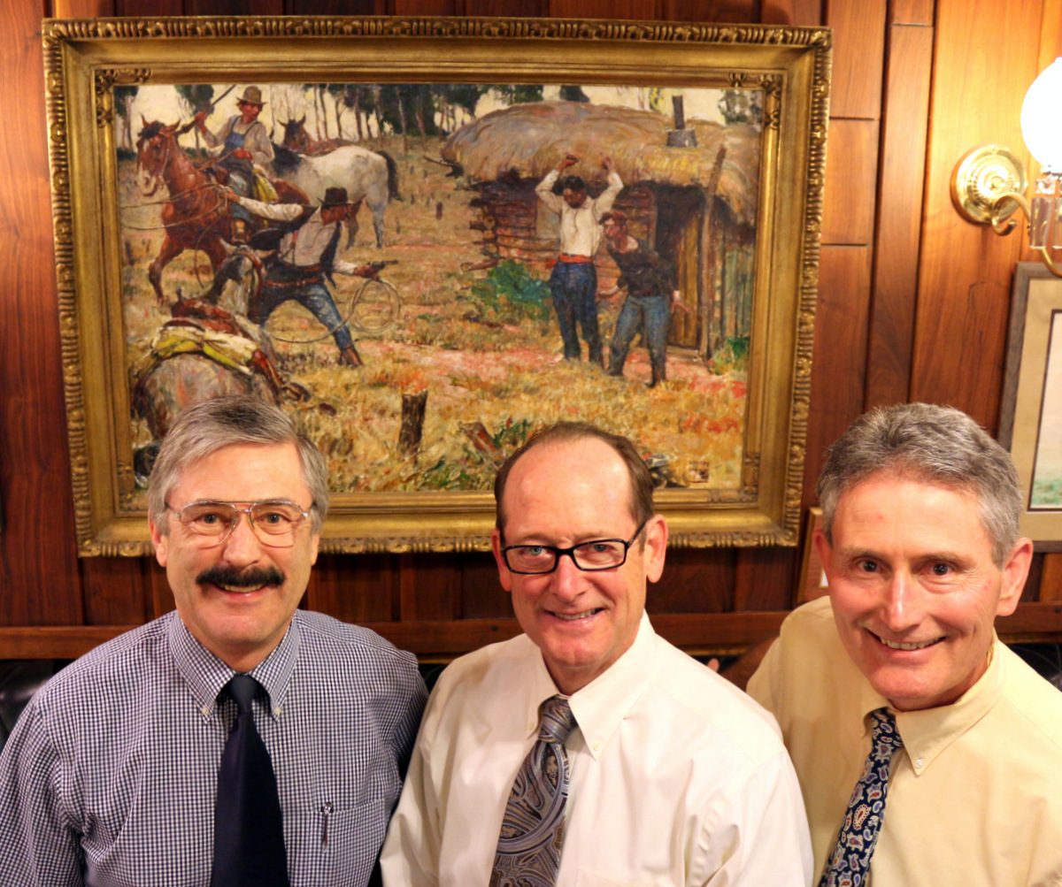 He is justly proud of recent acquisitions that include a $175,000 Harvey Dunn and the Wyeth now valued at over $1/4 million. There are master works everywhere including Benton and Matt Clark, Morton Stoops, Will James and Carl Link to name only a few painters of the 300 originals. Since the art adorns public rooms, as do amazing bronze cowboy sculptures, admission is free. Actually admission is free to everything including their pharmacy museum, traveler’s chapel, water spouting amusement park and back yard. A giant $100,000 snorting T-Rex provides fun for the kids.