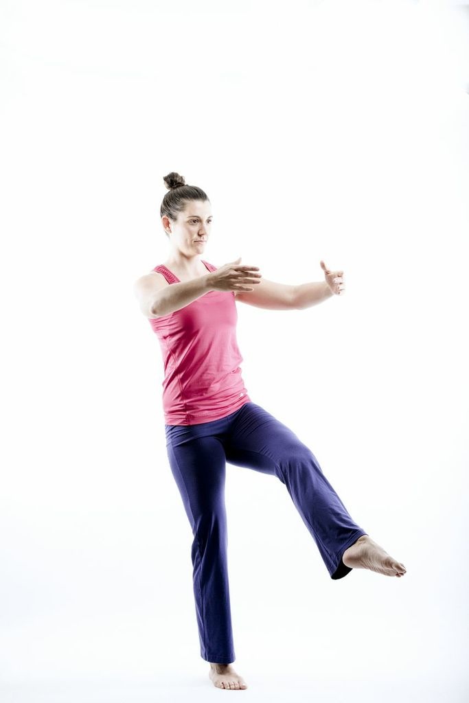 Set-Up. Stand tall and upright with your arms extended out in front of you. Have your legs turned slightly out in external rotation.