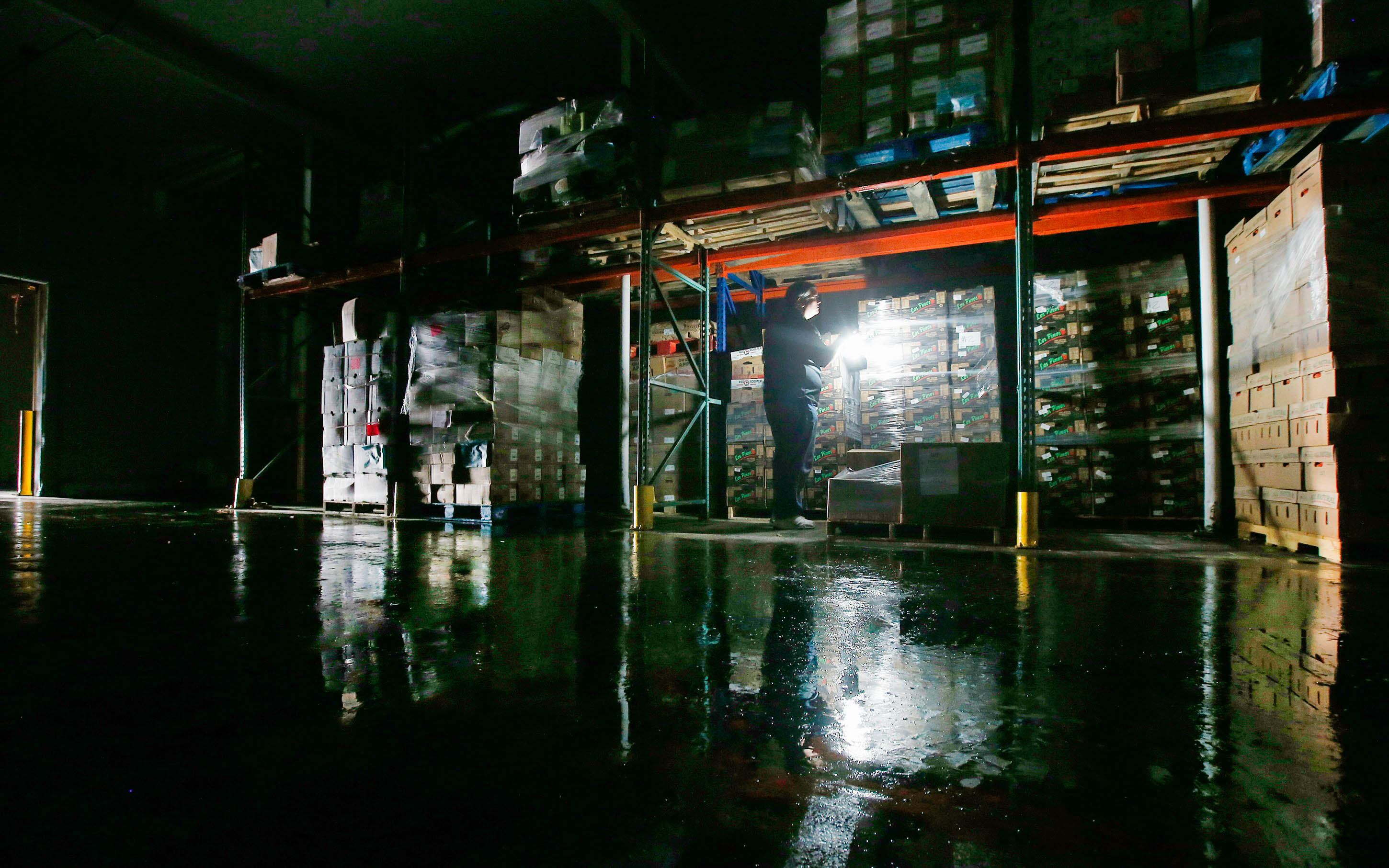 Without any electrical power, Jerry Brown, of the St. Mary’s Food Bank Alliance, uses a lantern to survey what food might be salvageable in the food bank freezer on Tuesday, Sept. 1, 2015 in Phoenix, after monsoon storms hit the Phoenix area Monday night knocking out power to thousands, delaying air travel, and stranding motorists in flash floods. (AP Photo/Ross D. Franklin)
