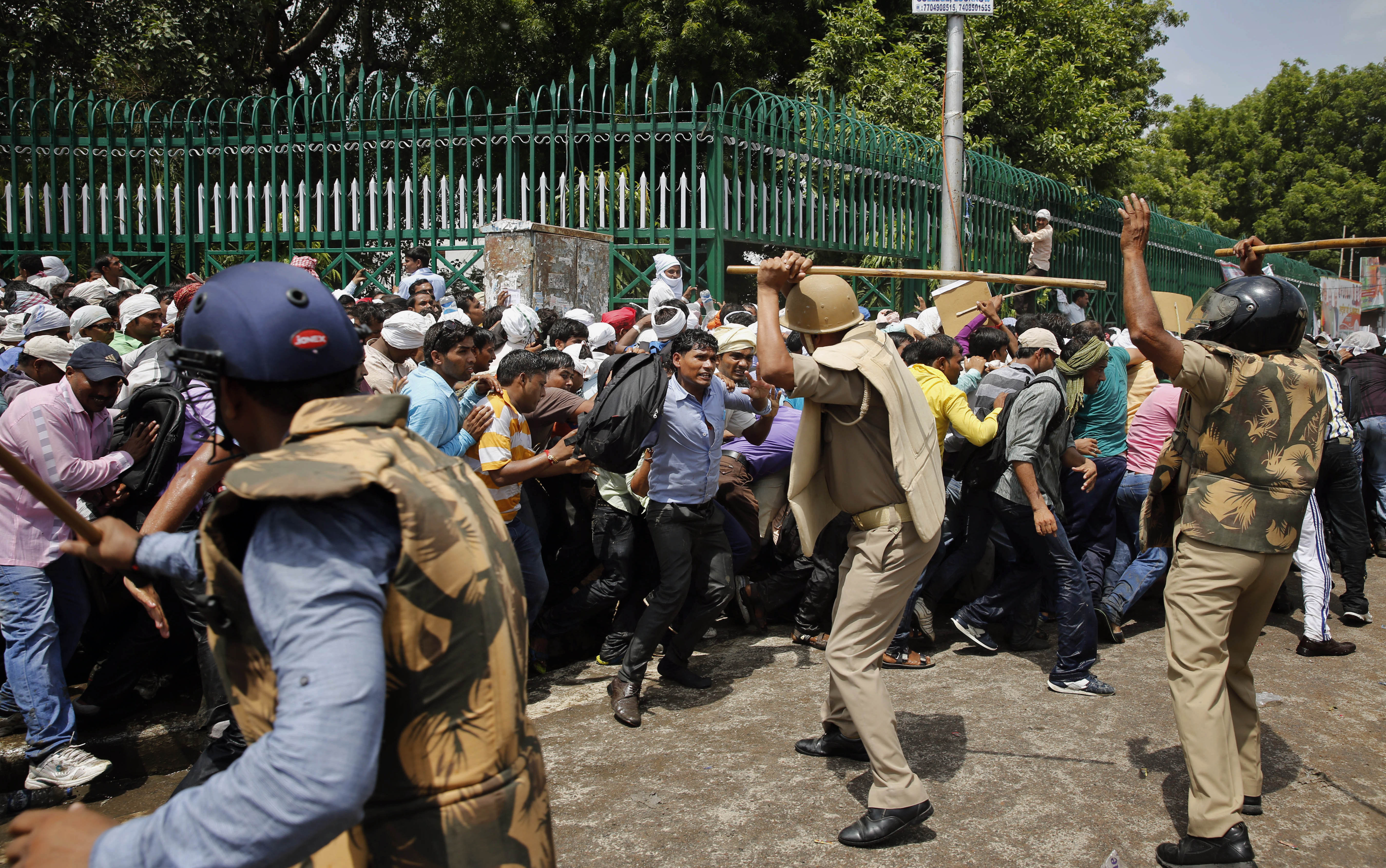 Kevin Norton and James Stumbo leave the courtroom following their dangerousness hearing at Boston Municipal Court, Tuesday, Sept. 1, 2015. The Iowa men, accused of making online threats of violence against the World Pokemon Championships competition in Boston, were ordered held without bail Tuesday after Judge Thomas Horgan rejected arguments by their lawyers that their comments amounted to idle online bravado. (Angela Rowlings/The Boston Herald via AP, Pool) Indian police baton-charge to disperse protesting youth of Bachelor of Physical Education during a protest in Lucknow, India, Tuesday, Sept. 1, 2015. Protesters, who demanded the state government allot permanent jobs to them, resorted to stoning as police used batons and water canons to disperse them near the legislative assembly Tuesday. (AP Photo/Rajesh Kumar Singh)
