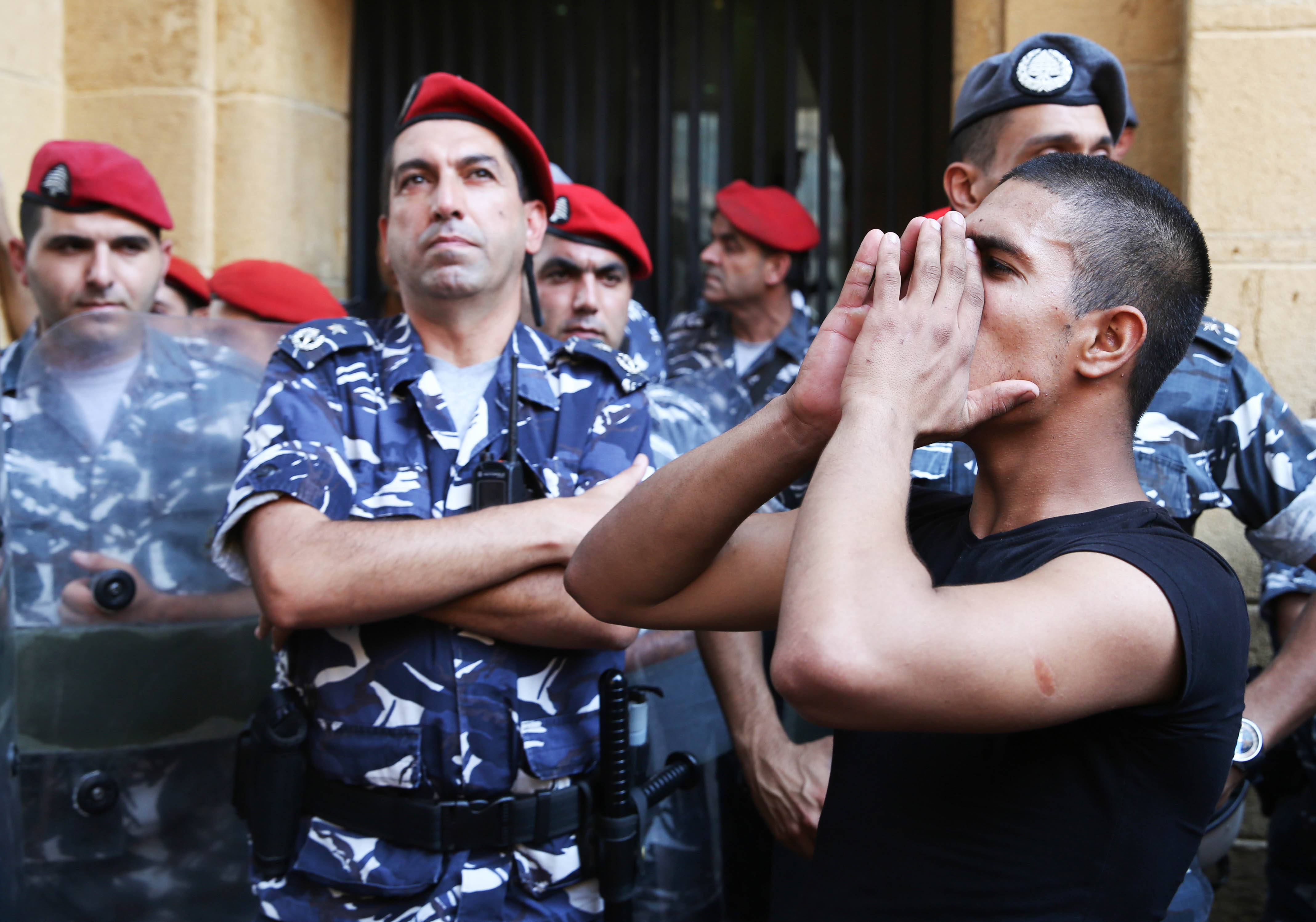 A Lebanese anti-government protester stands in front of policemen, as he shouts slogans outside the Environment Ministry in support of activists staging a sit-in inside, in downtown Beirut, Lebanon, Tuesday, Sept. 1, 2015. Lebanese security forces dragged a number of activists out of the Environment Ministry in downtown Beirut, where they were staging an hours-long sit-in on Tuesday demanding the minister’s resignation over a trash crisis that has ignited mass protests. (AP Photo/Bilal Hussein)