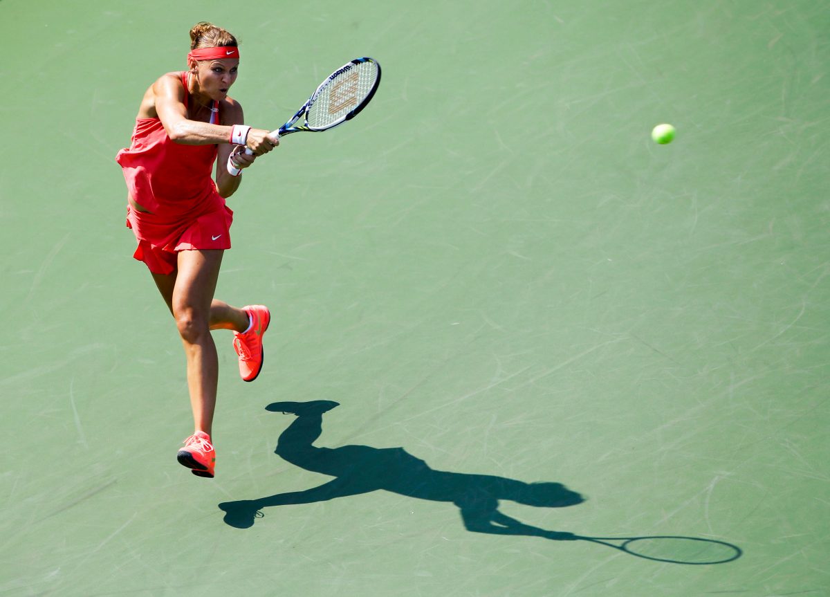 Lucie Safarova, of the Czech Republic, returns a shot to Lesia Tsurenko, of Ukraine, during the first round of the U.S. Open tennis tournament, Tuesday, Sept. 1, 2015, in New York. (AP Photo/Matt Rourke)