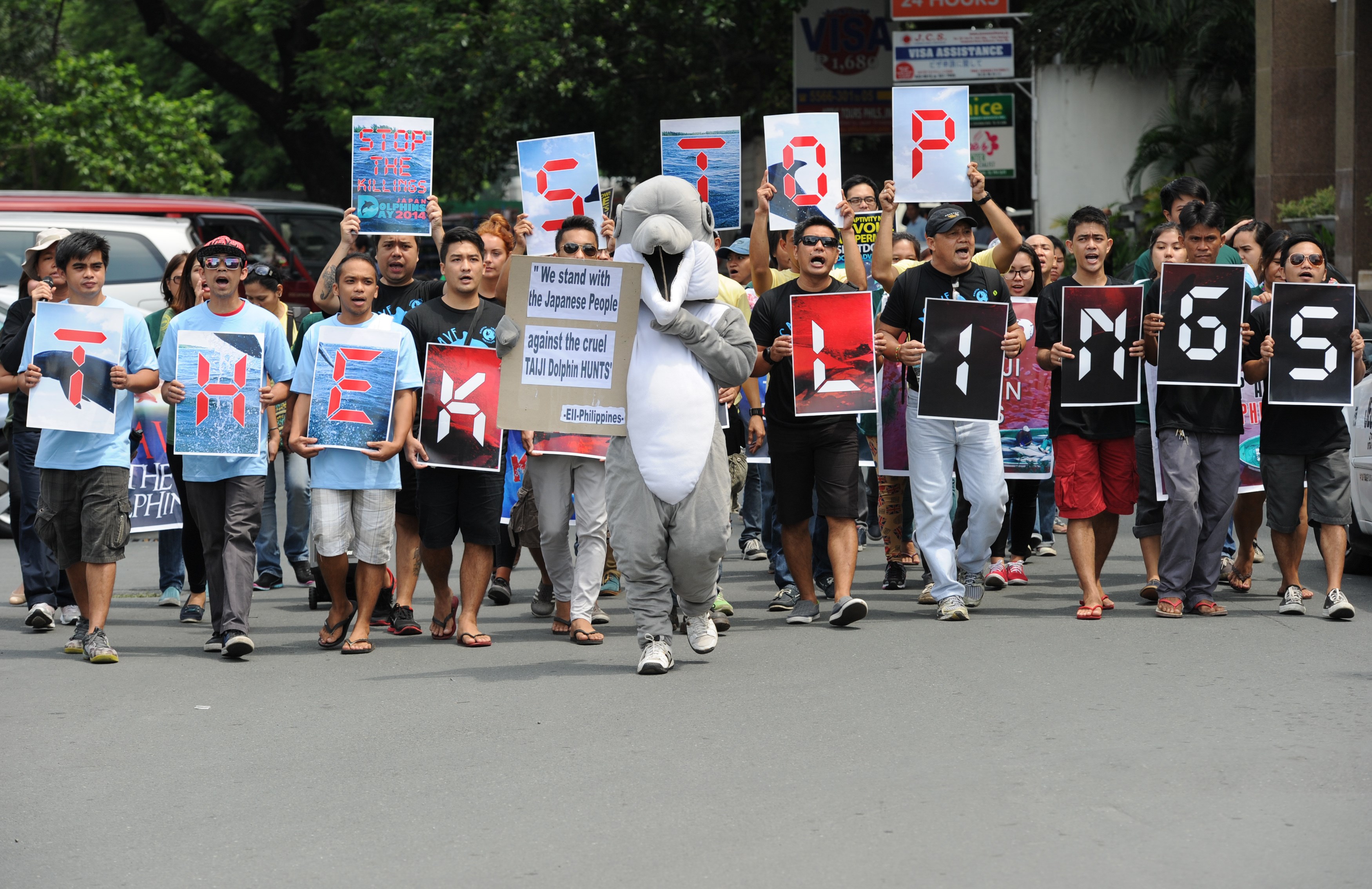 An animal activist wears a dolphin suit during a rally in front of the Japanese embassy in Manila on Sept. 1, 2015, to protest against the annual dolphin hunt. The annual controversial dolphin hunt has kicked-off in the town of Taiji, Japan. In the annual catch, people from the southwestern town corral hundreds of dolphins into a secluded bay and butcher them, a scene thrust into the global spotlight in “The Cove”. (Ted Aljibe/AFP/Getty Images)