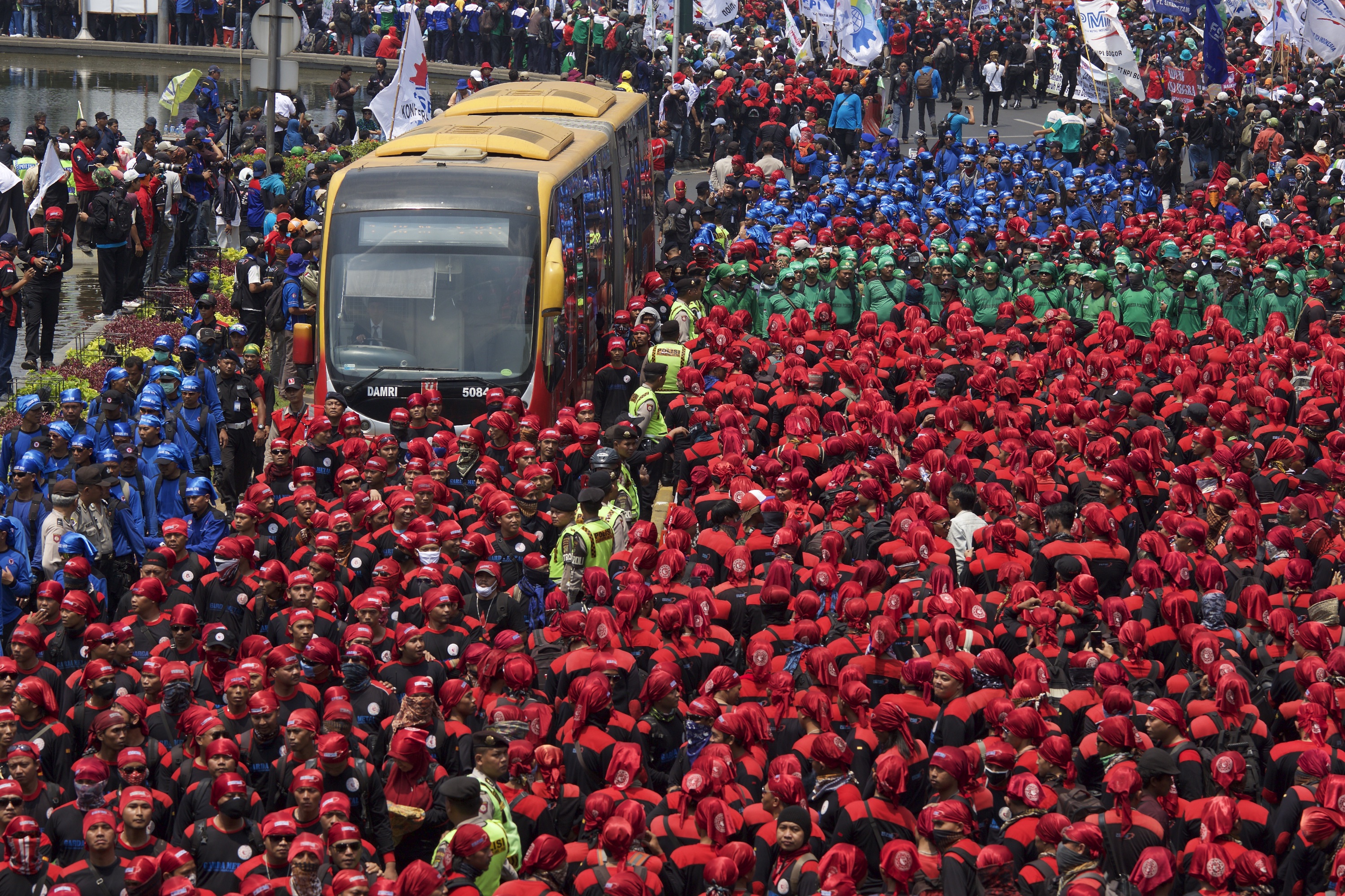 A city commuter bus tries to pass by thousands of Indonesian workers and labor activists as they march to the Presidential Palace to protest against higher prices for basic goods and increasing layoffs for factory workers on Sept. 1, 2015, in Jakarta, Indonesia. Indonesia’s currency, the Rupiah has weakened against the dollar making imported goods, many of which are necessities, more expensive at the same time a global trade slump has forced the closing of many export based businesses. (Ed Wray/Getty Images)