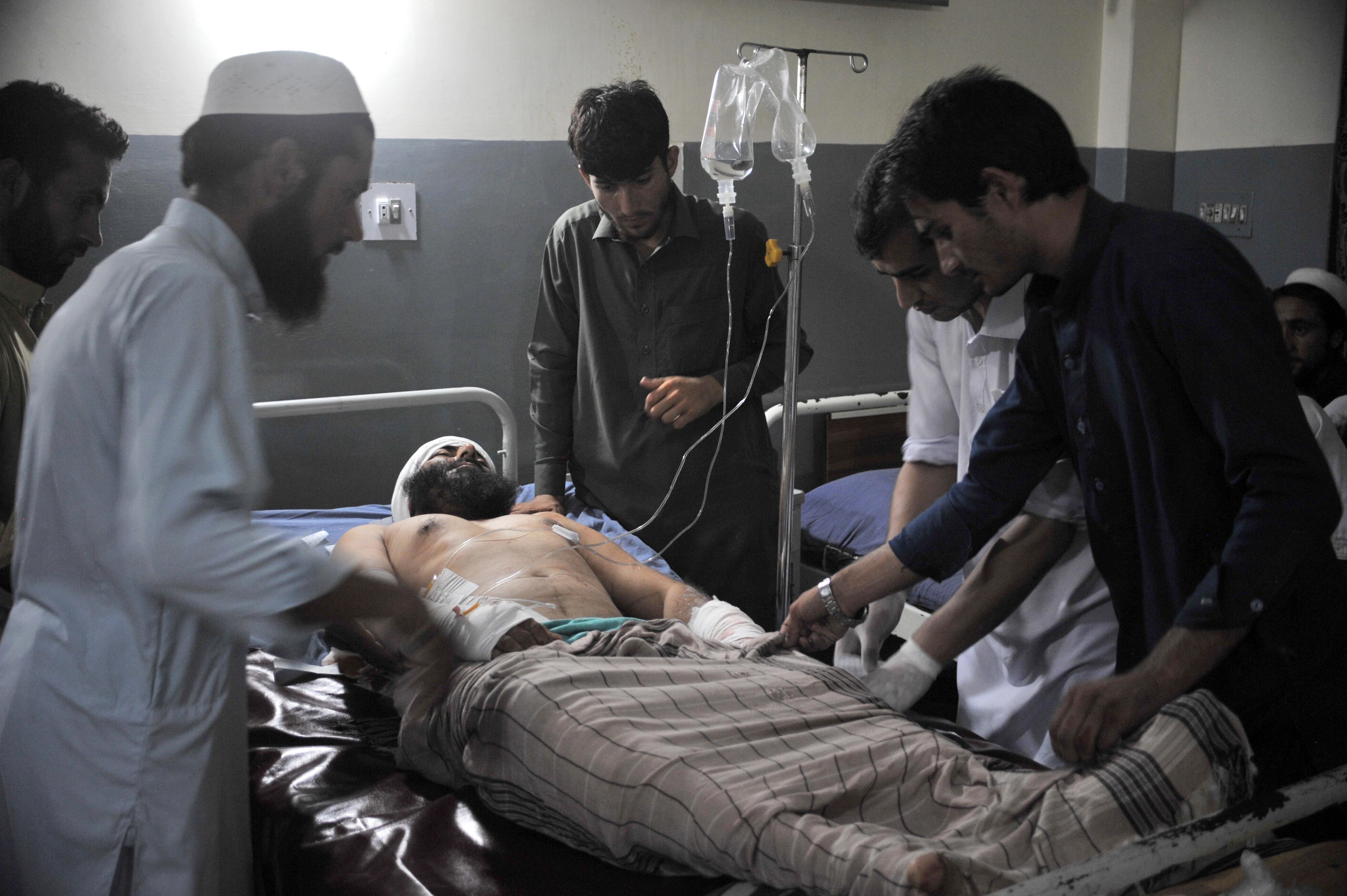 Pakistani paramedics treat an injured blast victim at a hospital in Peshawar on Sept. 1, 2015, after a suicide bomb attack in the town of Jamrud in the Khyber tribal agency bordering Afghanistan. A suicide bomber killed at least six people and wounded 31 others when he blew himself up outside a local government office in a northwestern Pakistani tribal area, officials said. (Hasham Ahmed/AFP/Getty Images)