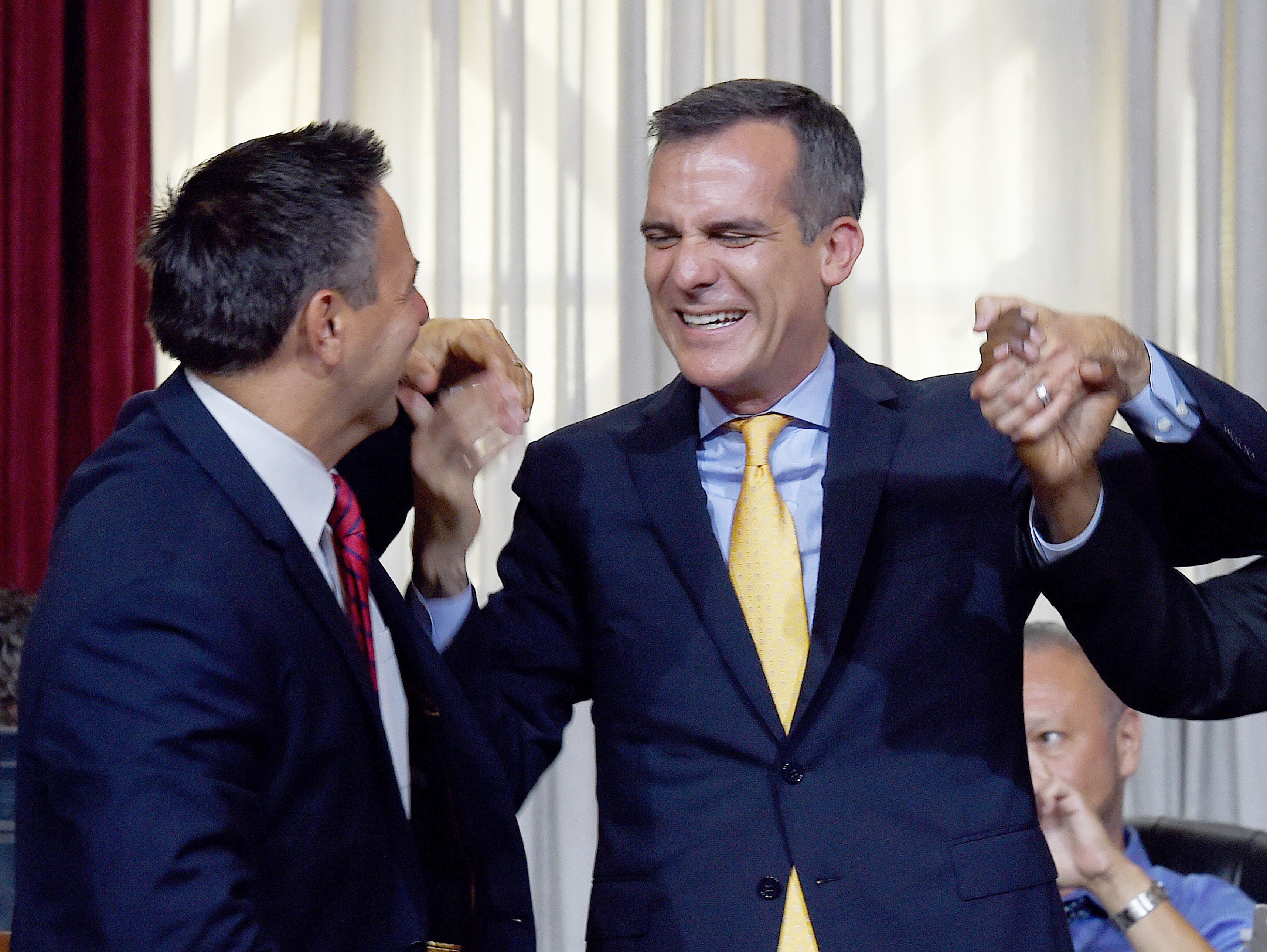 Los Angeles Mayor Eric Garcetti (R) celebrates with Los Angeles City Councilman Joe Buscaino (L) after the council voted to bid for the 2024 Summer Olympics, at City Hall in Los Angeles, California on September 1, 2015. Los Angeles leaders on Tuesday gave unanimous backing to the city’s bid for the 2024 Olympics, paving the way for it to enter the race for the Games. The Los Angeles City Council voted 15-0 in favor of a “joinder agreement” designed to demonstrate to the United States Olympic Committee (USOC) that the city was committed to staging the Games.” The USOC is expected to forward Los Angeles — who have hosted the Games on two previous occasions in 1932 and 1984 — as a candidate for the 2024 race imminently. (Mark Ralstone/AFP/Getty Images)