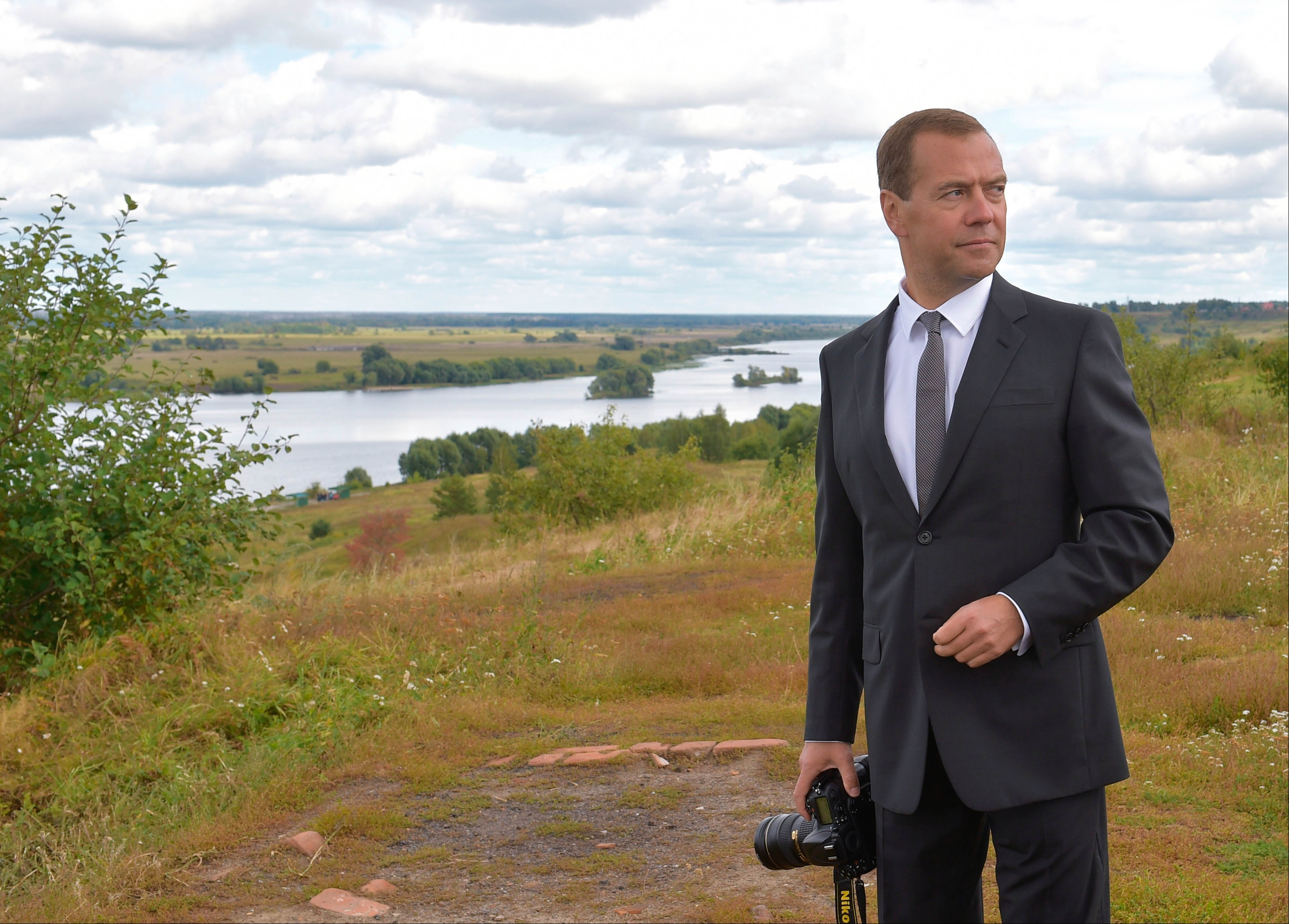 Russian Prime Minister Dmitry Medvedev visits the museum of the famous Russian poet Sergei Yesenin in the village of Konstantinovo, Ryazan region, 200 km (125 miles) southeast of Moscow, Russia, Tuesday, Sept. 1, 2015. (Alexander Astafyev/RIA-Novosti, Government Pool Photo via AP)
